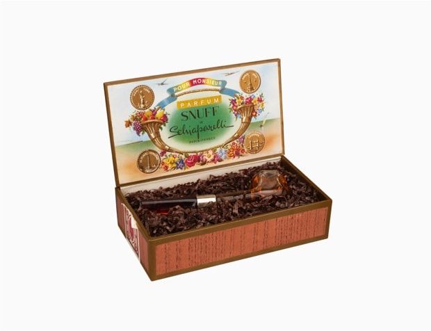 Elsa Schiaparelli launches are her only men’s fragrance, Snuff. It is a daring reference to smoking, a key element of manhood of the time. Following a signature surrealist theme, the bottle is inspired by famous René Magritte paintings and comes in the shape of a pipe while the packaging is in the style of a cigar box.