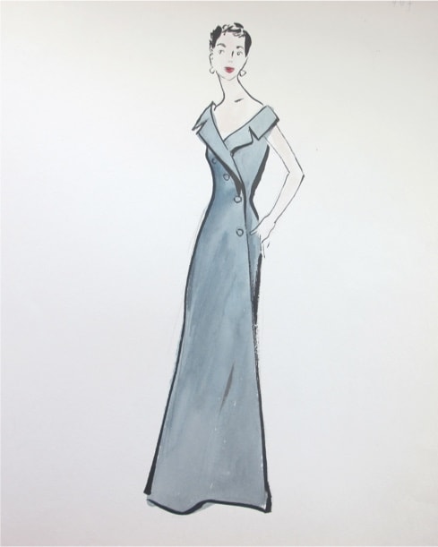 The first tuxedo dress makes its debut in the 1950 Haute Couture collection. The piece features experimentation with diagonal buttoning.